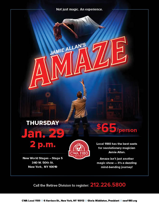 Thurs. 1/29 | Amaze $65/person | New World Stages – Stage 5 Call the Retiree Division to reserve your spot today: 212.226.5800 |