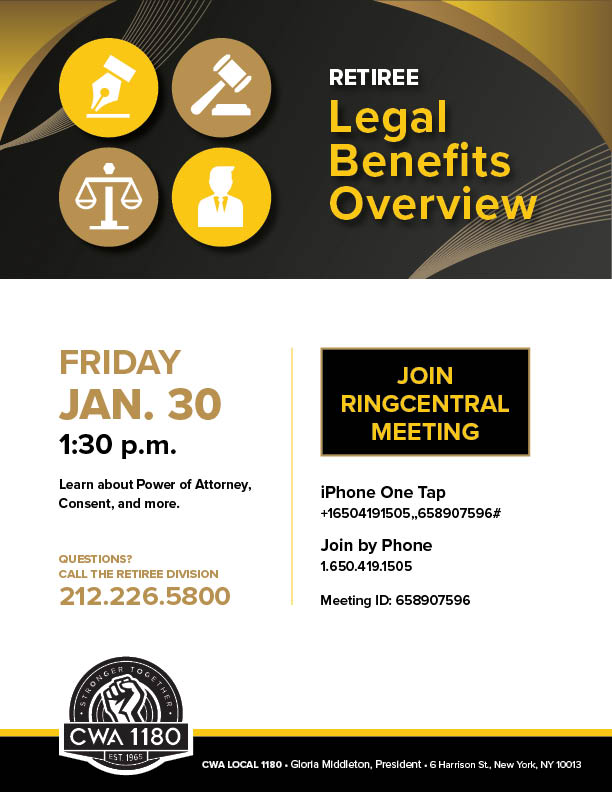 Fri. 1/30 | Legal Benefits Overview Learn about Power of Attorney, Consent, and more. | Join from PC, Mac, iOS or Android: iPhone One Tap Join by Phone Meeting ID: 658907596 |